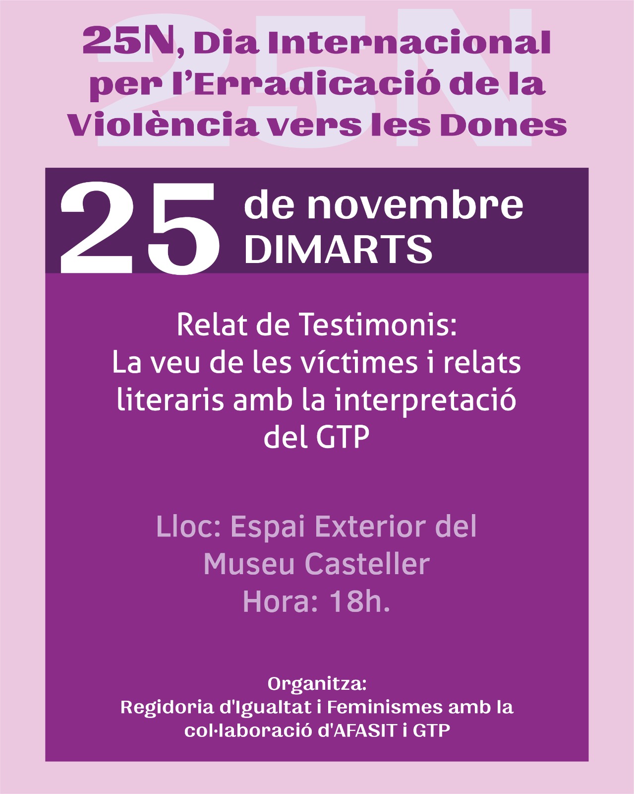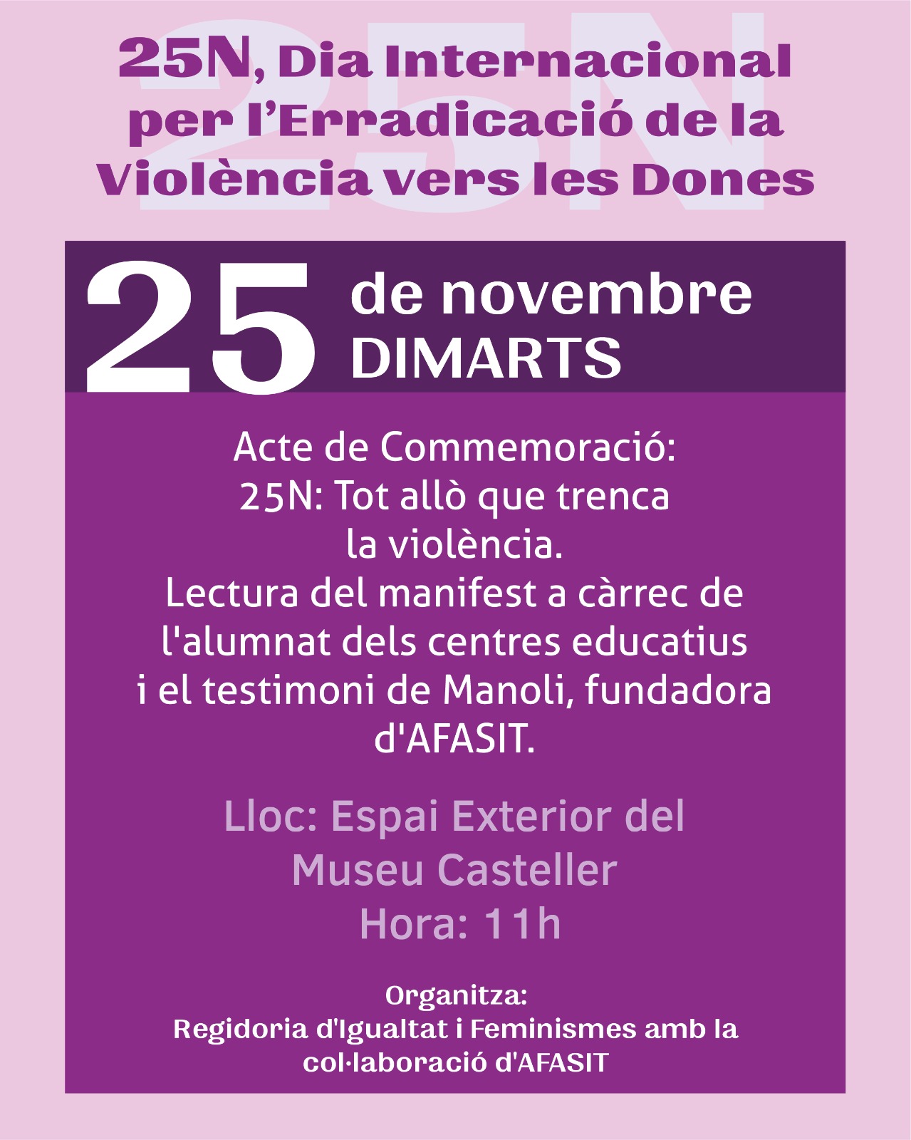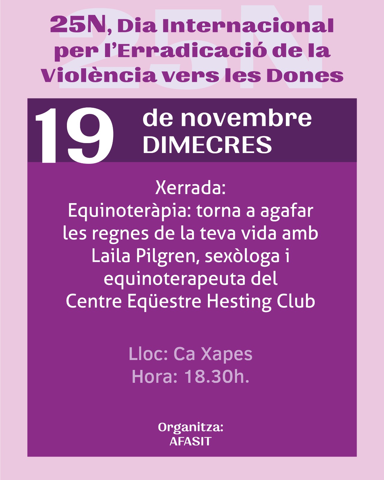 Durant aquest mes i al voltant de la setmana del 25N AFASIT es suma amb varies activitats per l'erradicació de la violència vers les dones i la prevenció de les VSI.